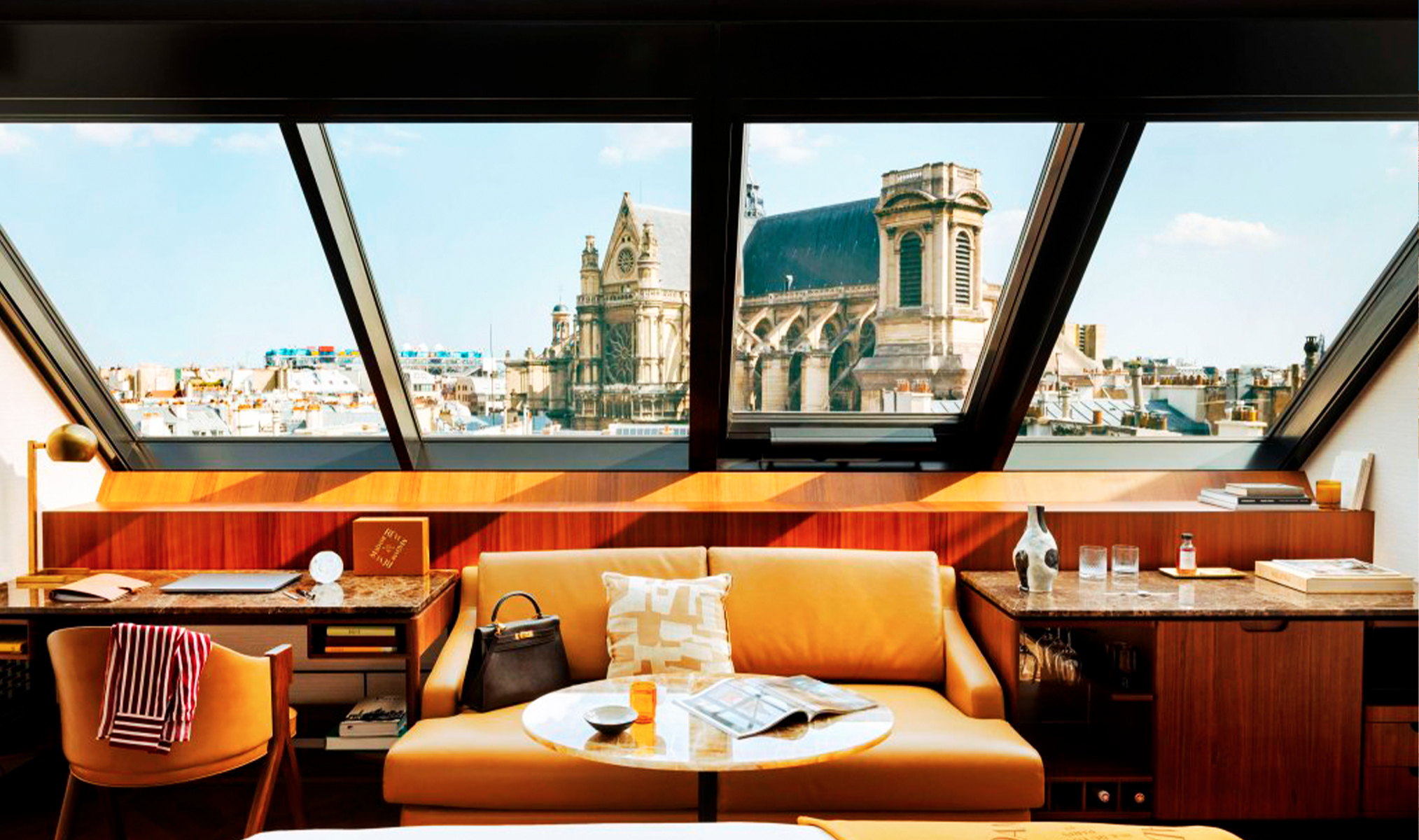 Hôtel Madame Rêve: Bask in the Parisian glow under a captivating glass roof, merging urban vistas with unparalleled interior elegance.