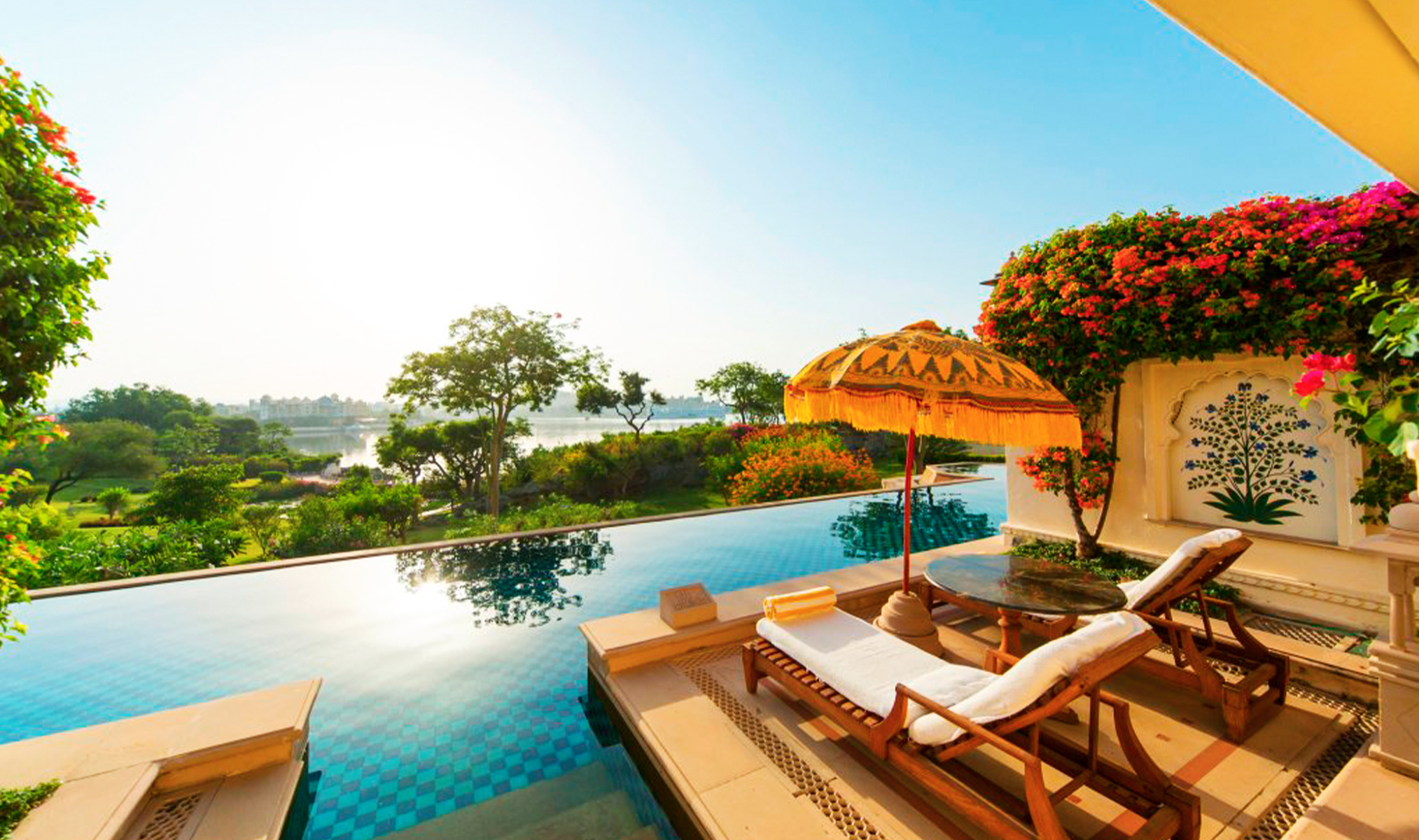 The Oberoi Udaivilas: Revel in opulence as serene gardens meet tranquil pool views, epitomizing the essence of India’s finest resort luxury.