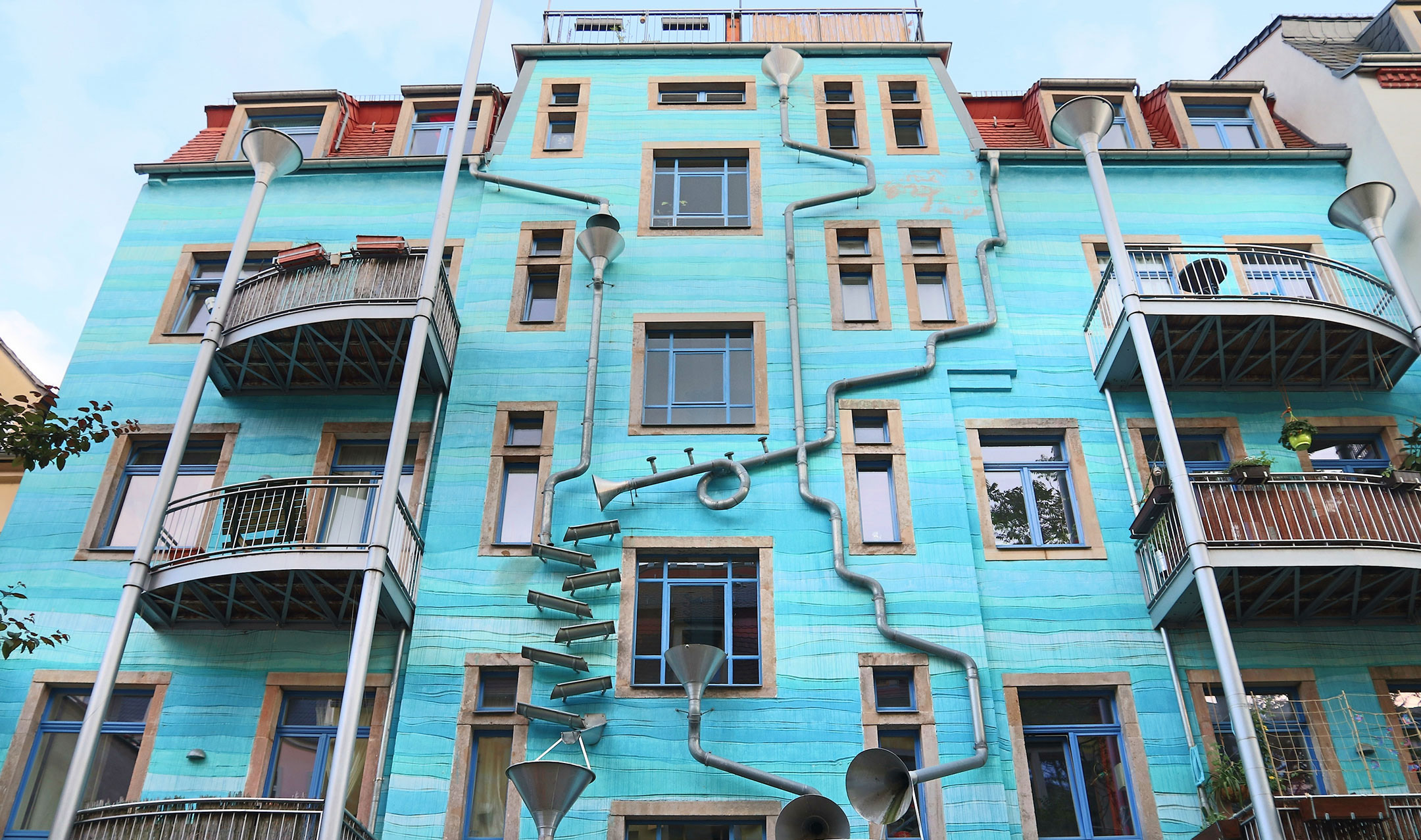 20 years ago, artists revived the rundown courtyards of Neustadt between Görlitzer Str and Alaunstraße. The result was five courtyards, all decorated in different styles with the: Courtyard of the Elements, Courtyard of Mythical Creatures, Courtyard of Light, Courtyard of Metamorphoses, and Courtyard of Animals.