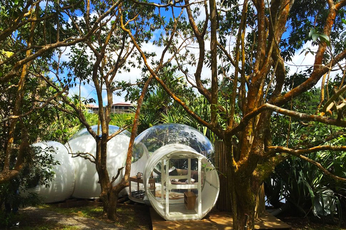 Rooms hidden in greenery are entirely shaped as transparent domes.