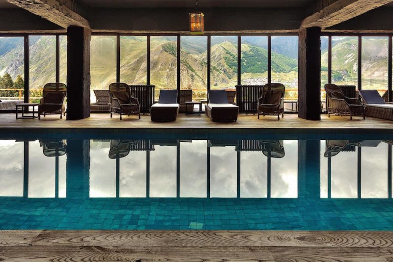 The hotel is designed using only natural materials such as 150-year-old oak fixtures and features neutral, calm colours. Wherever possible, there are floor-to-ceiling windows – in the lobby, in the pool, in the library and, of course, in the rooms. It’s as if nothing should come between you and nature. You lie on the bed and can’t help but admire the snowy slopes of the Caucasian ridge. Take a dip in the pool and swim with the outline of Mount Kazbek in the background. Sit with a glass of wine on the terrace and become one with the star-filled sky.