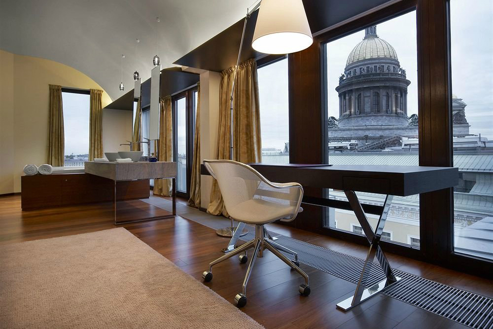 Many of the hotel room windows of the Sofitel So look out over the picturesque roofscapes of St. Petersburg and the suites have direct views over St Isaac’s Cathedral itself. In the SO VIP apartment bathrooms you can even enjoy the romantic views from a bathtub for two, snug in your bathrobe looking over the snow-crowned dome. Walk from the bathroom to the open fireplace and you feel more like you’re in a cosy Alpine chalet than in Russia’s northern capital. The crowning glory is the view from the rooftop restaurant with its terrace and picture postcard views over the historic centre of the city.