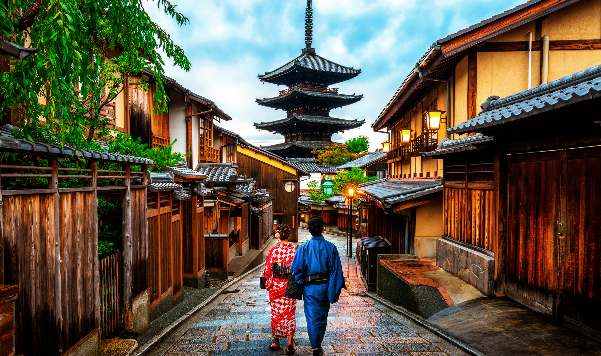 As the dusk descends on Kyoto, lanterns flicker to life, casting a warm glow over cobbled streets that lead past venerable temples and under the graceful silhouette of a towering pagoda, setting the stage for a dance with history in the heart of Japan.