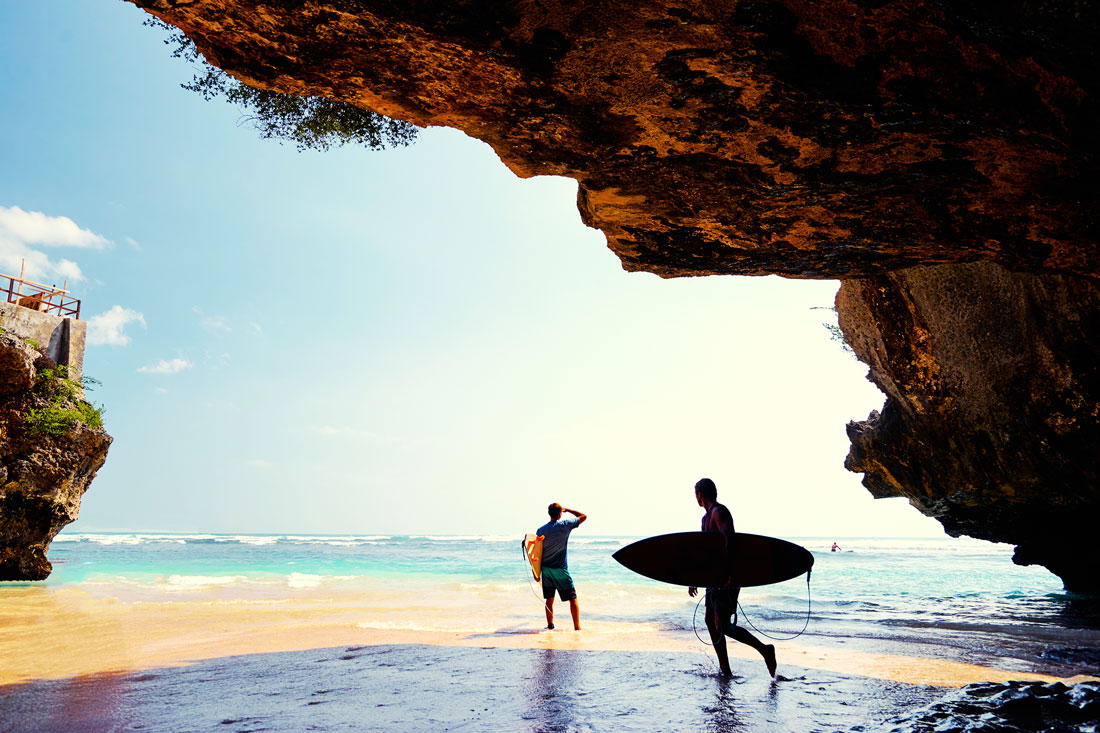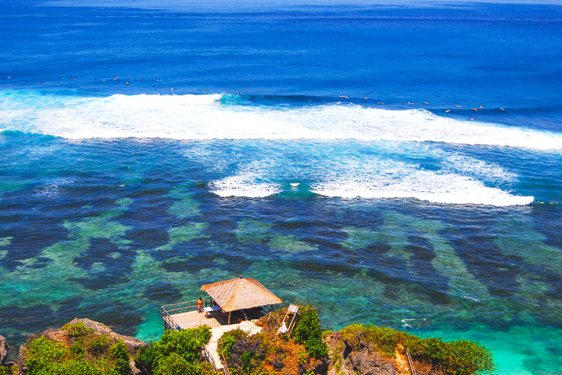 Uluwatu and Padang-Padang Beach area in the east of Bukit. There are two types of venue, one for beginners with short, straight waves, and one for more experienced surfers where the waves form long, irregular, and complex “tubes” and the current is strong.