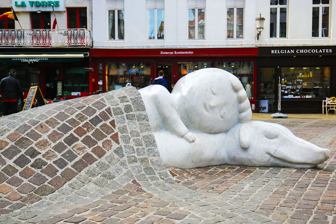 If you have managed to resist the temptation to spend the day shopping, then yo have probably made it as far as the Cathedral of Our Lady of Antwerp. There are not many tall buildings in the historic center, so finding the cathedral won’t be difficult. As you approach the cathedral, your attention will be drawn to the loveliest little monument in the world – a little boy hugging a dog under a blanket made out of cobblestones.