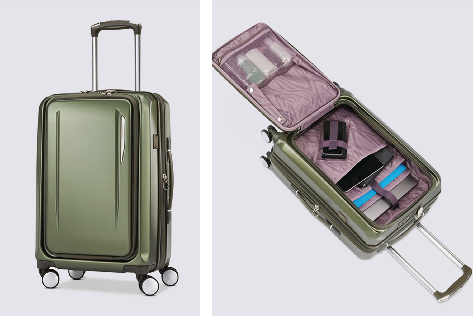 If you travel for work, you’ll want to choose a suitcase with a built-in laptop case and a longer warranty. This expandable spinner bag from Samsonite ticks the boxes with a front pocket that makes it easy to access your laptop throughout your travel. The pocket has an in-built 15-inch laptop sleeve, a USB charging port, additional storage pockets, and space for your documents and other tech essentials. Keep your belongings safe with separate locks for the main and front compartments.