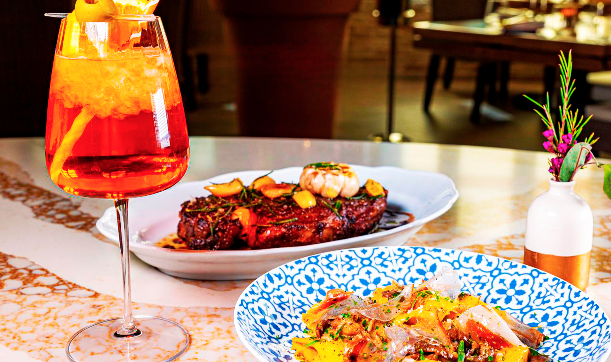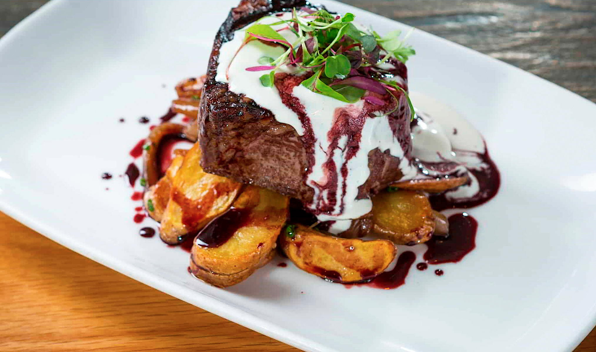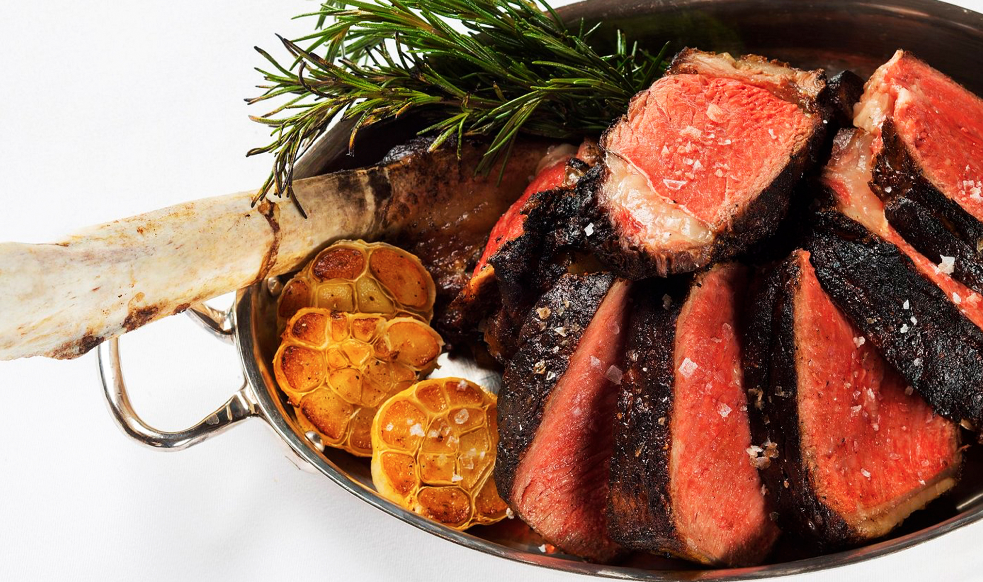 Choose between the weekend brunch menu and the á la carte dinner options, including 30-day dry-aged steaks and smoked salmon pizza.