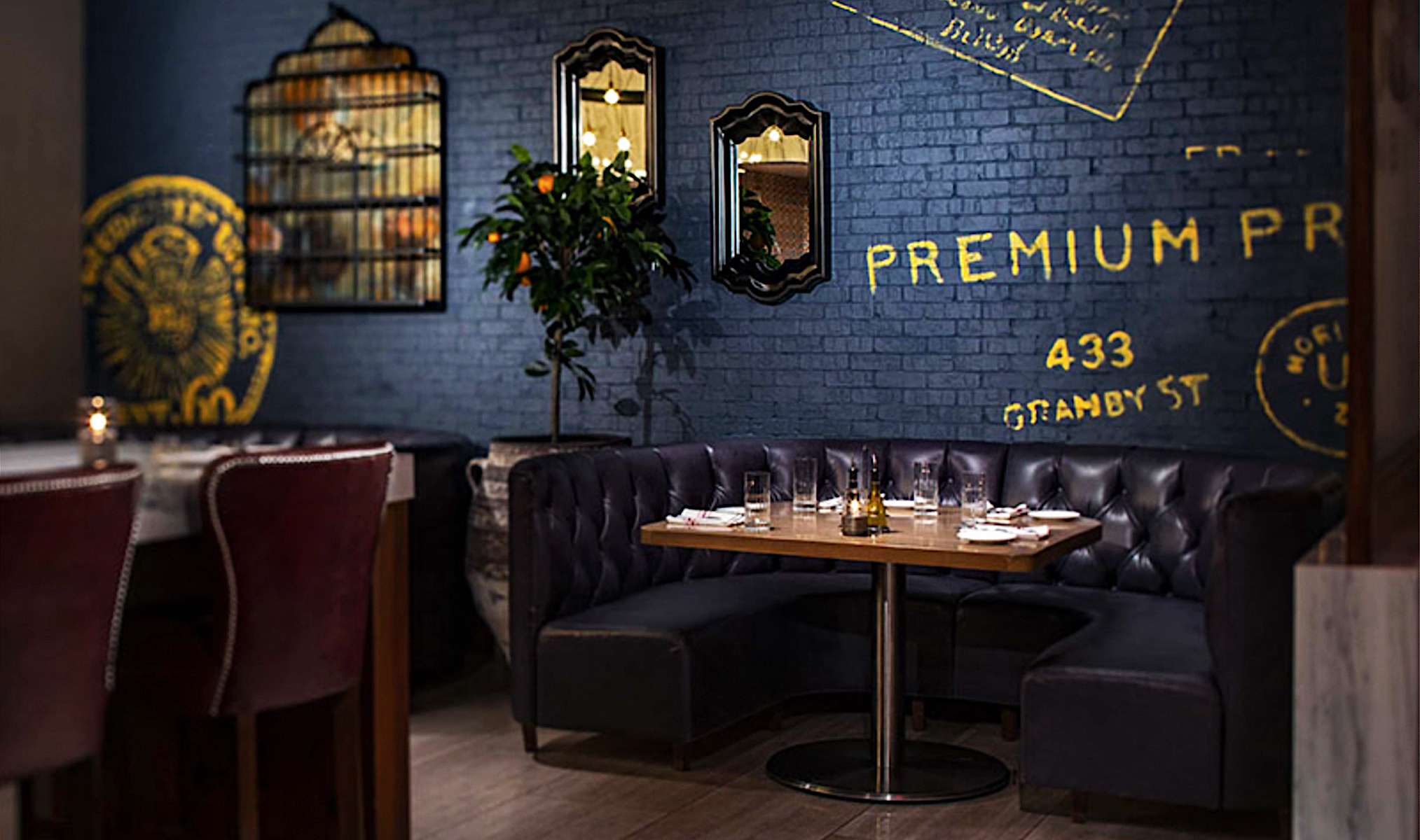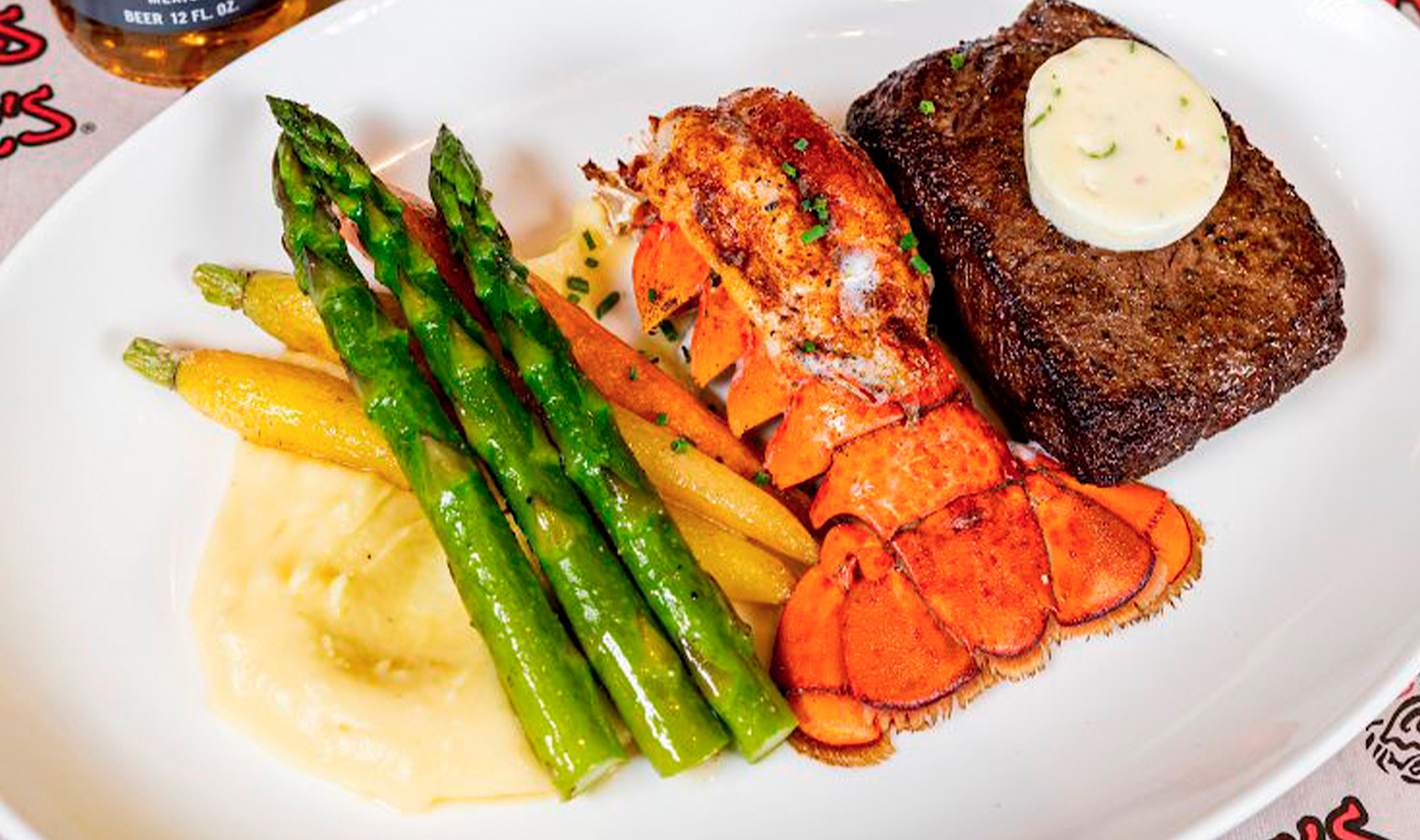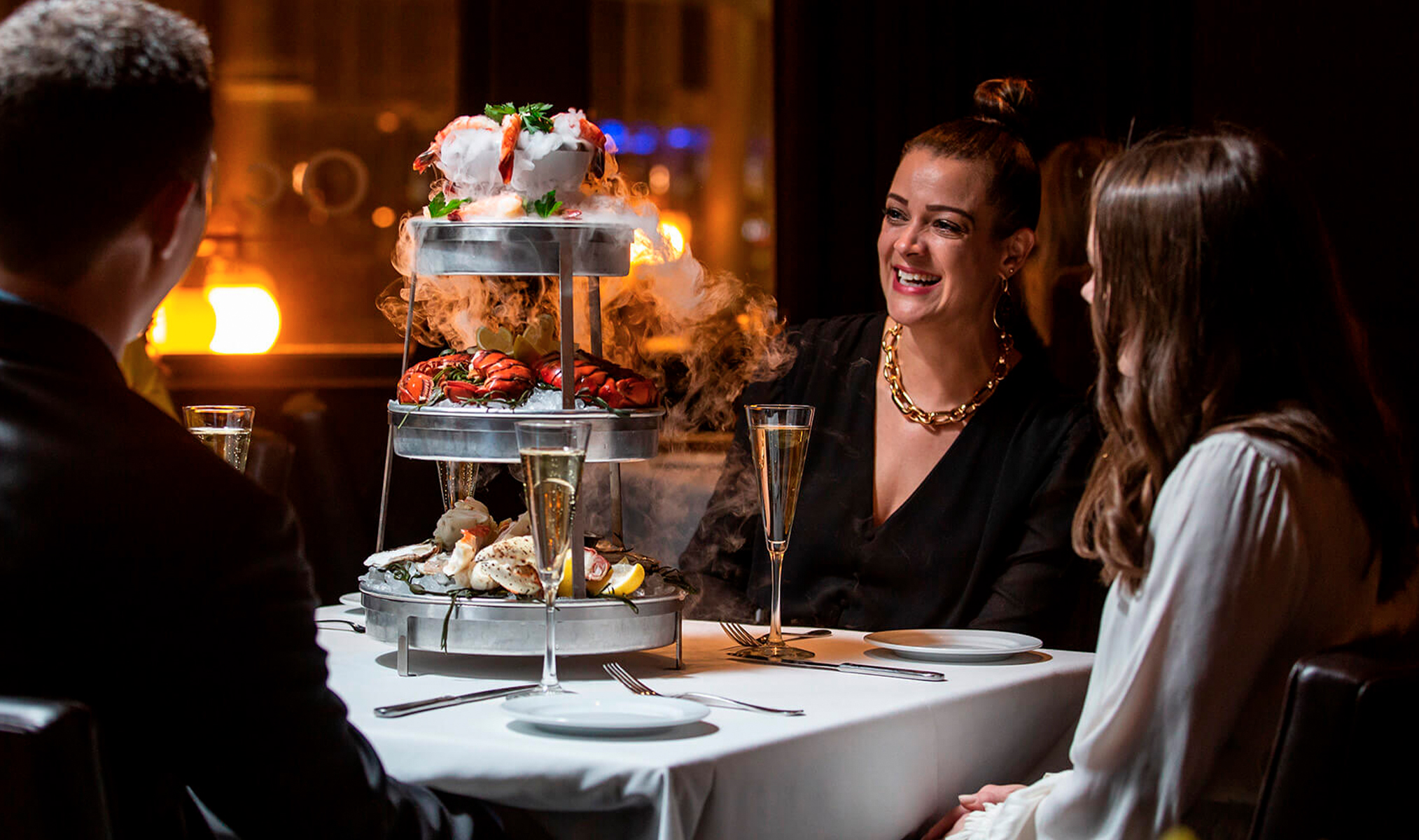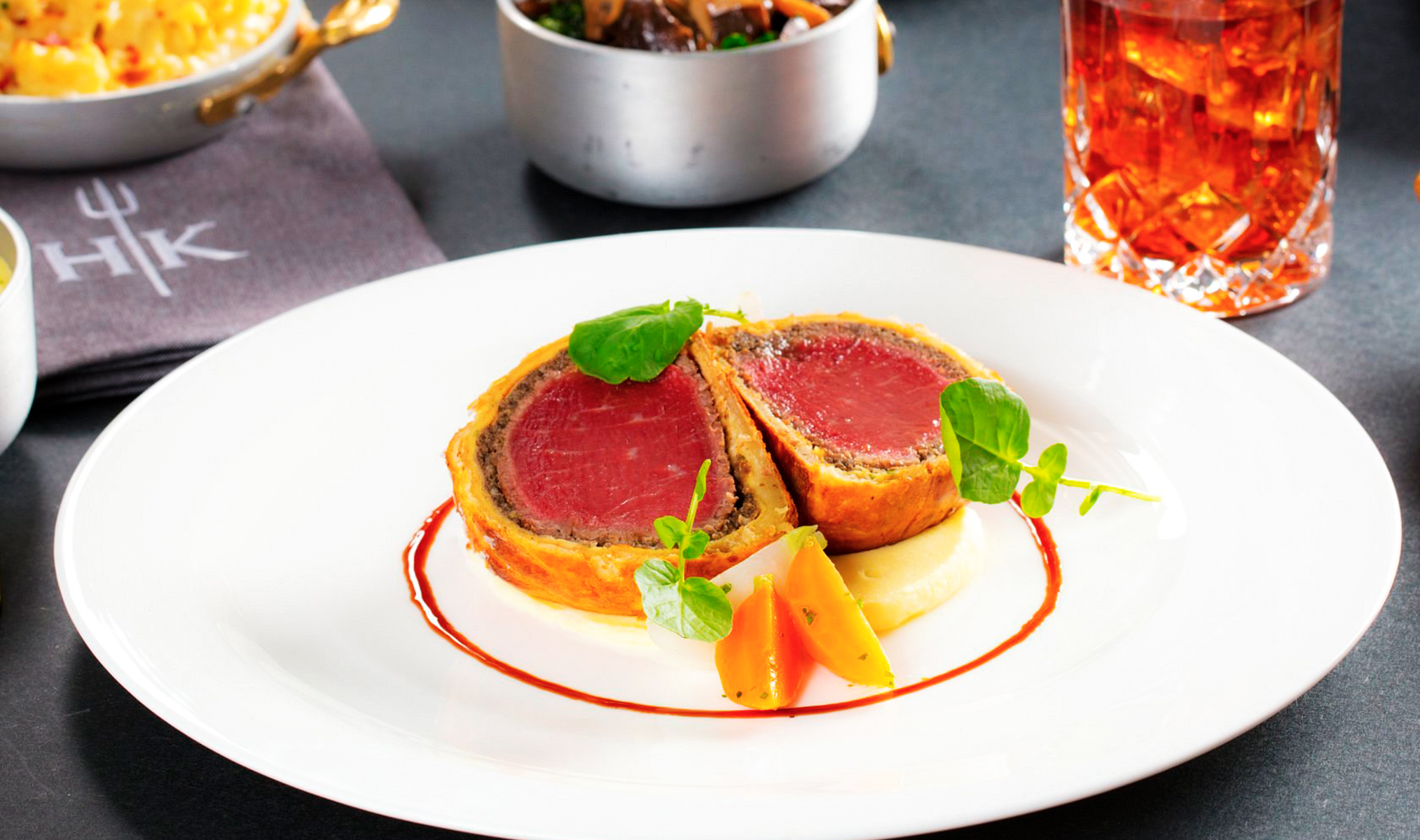 Choose between the weekend brunch menu and the á la carte dinner options, including 30-day dry-aged steaks and smoked salmon pizza.