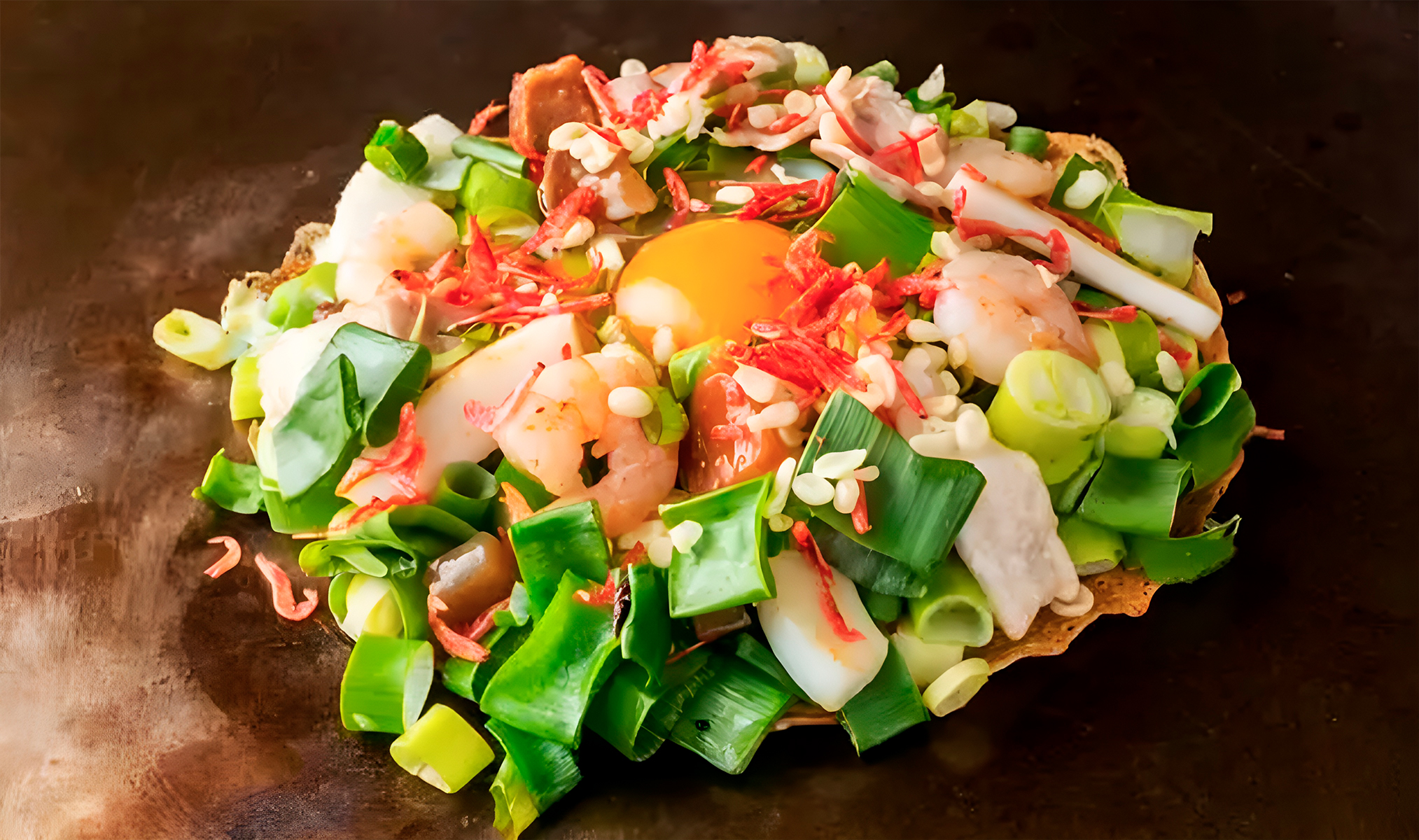 If you prefer an option with more vegetables or aren’t a fan of seafood, choose negiyaki – the dish this restaurant is most known for – which replaces the sliced scallions for cabbage.