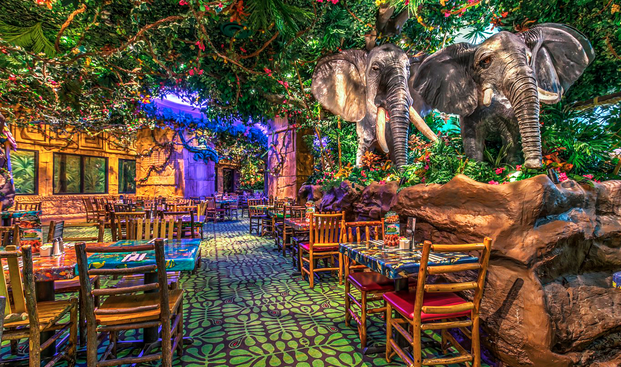 Take a quick trip into an exotic rainforest adventure at the Rainforest Cafe. This unique restaurant is decorated wall to wall with lush greenery and lifelike animatronic animals, creating a truly immersive and unforgettable dining spot to eat at. With a wide variety of mouthwatering dishes on the menu, including vegetarian and gluten-free options, there’s something for everyone.