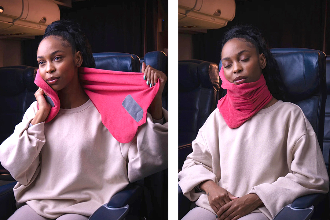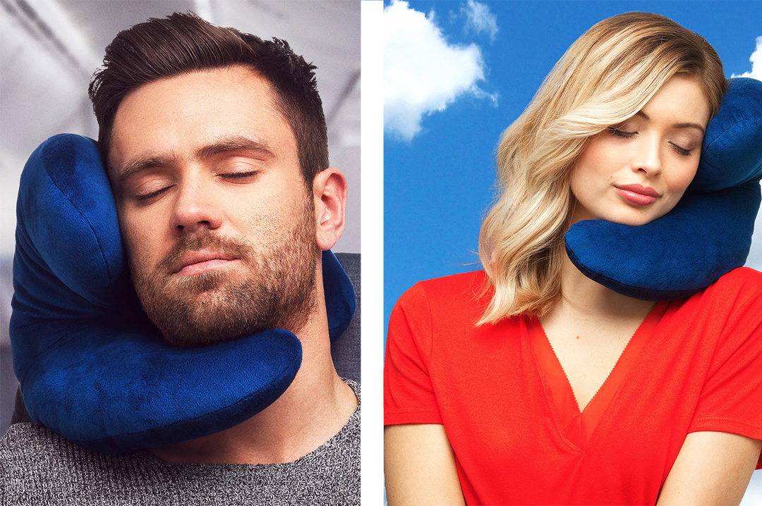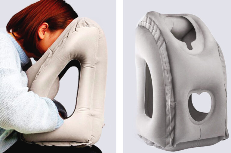 This option borrows its concept from massage tables. While it’s guaranteed to earn you a few curious looks from your fellow travelers, it’s a style we’re seeing all over social media as an Amazon top-seller. If you usually rest on your tray table when flying, this inflatable neck pillow is the perfect alternative.