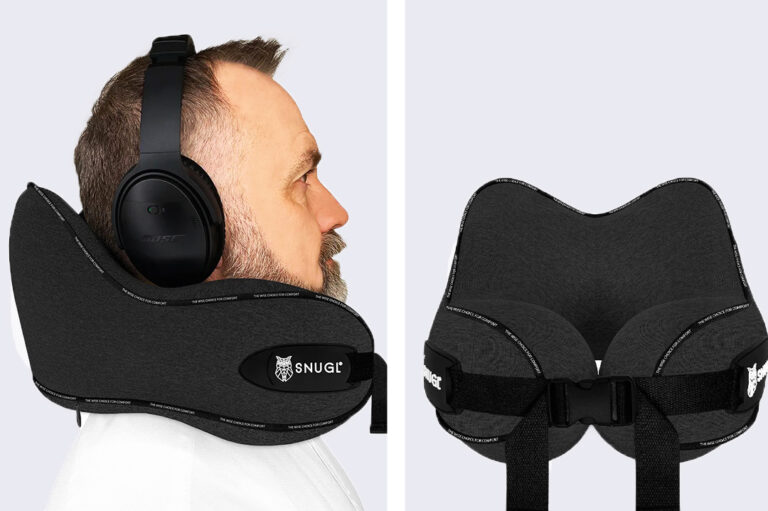 The neck and bag pillow – known as “The Nab” – is a zippered shoulder bag with a carry strap. It’s a better option for short-haul flights as an emergency backup if you need extra space while packing. The ultra-soft fabric creates a plush pillow to rest against, but it lacks an ergonomic design..