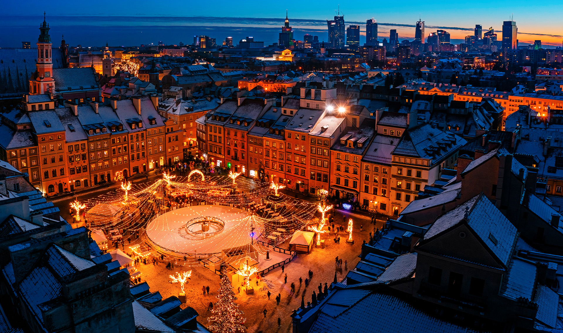 Twilight descends on Warsaw’s old town, where the festive cheer of the Christmas Fair weaves through the market square, aglow with the warm lights of Polish tradition and holiday mirth.
