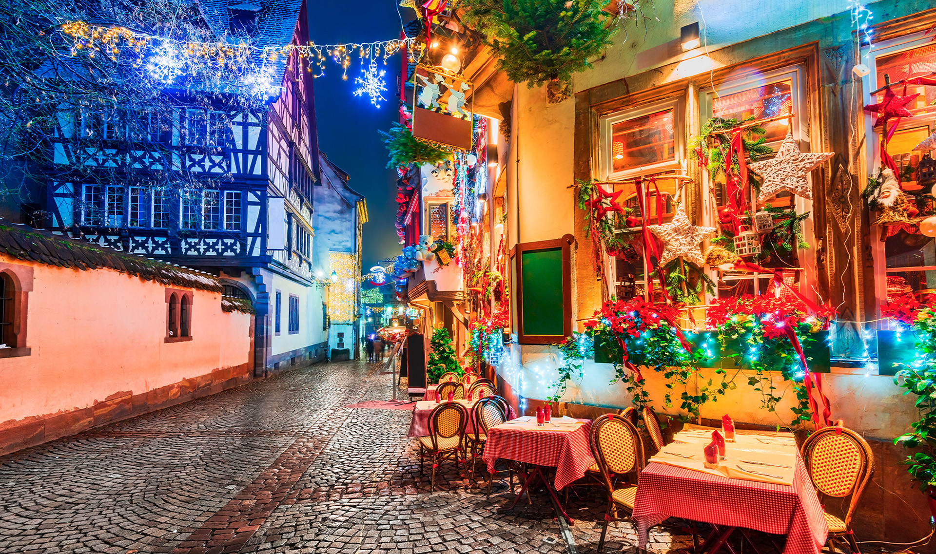 Strasbourg, France. Street cafe tables on Winter Street, Christmas time. Alsace night scene with highlighted old buildings in touristic concept.
