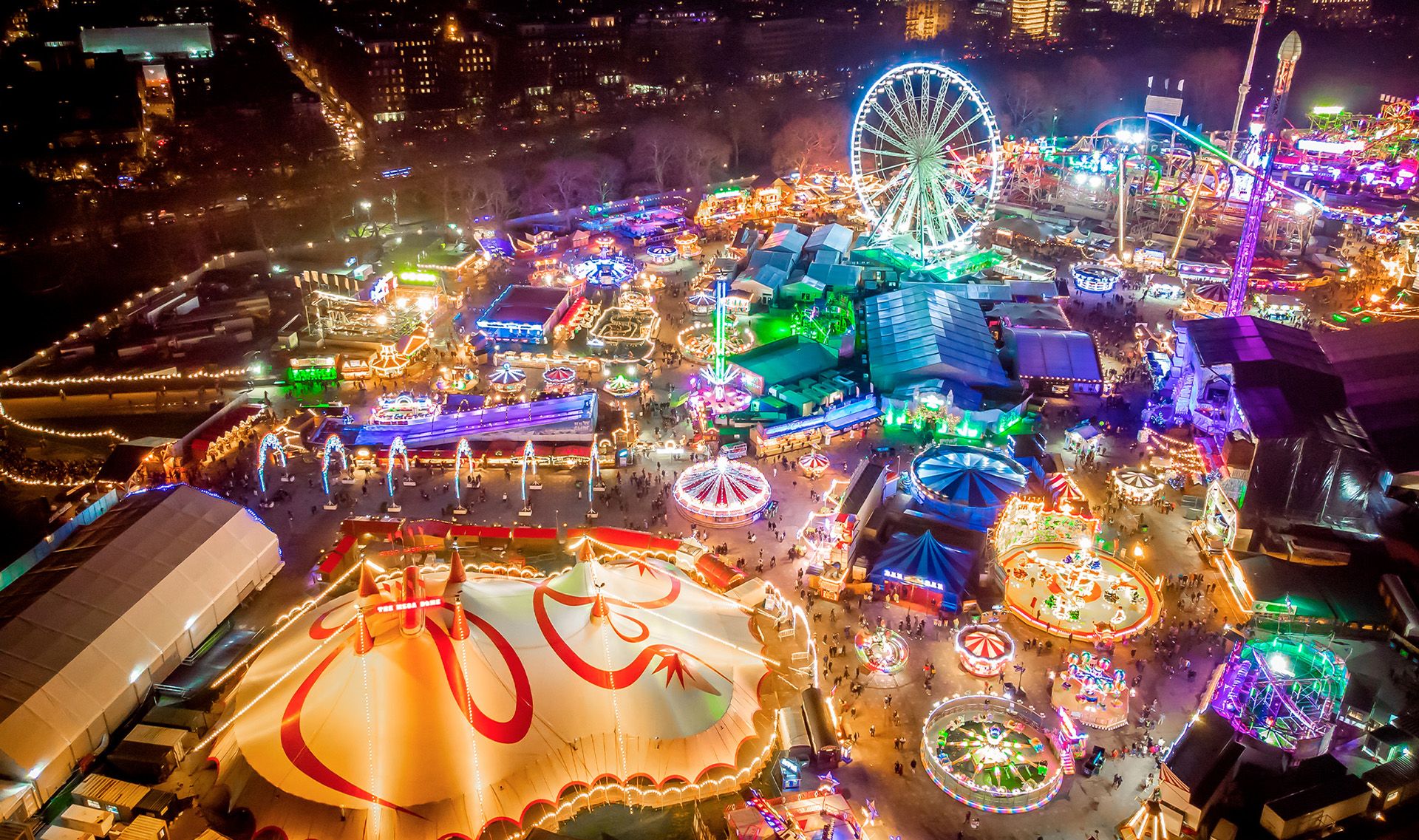 Hyde Park’s Winter Wonderland glistens from above, a carnival of festive lights and joy, offering a dazzling escape into London’s beloved Christmas fairyland.