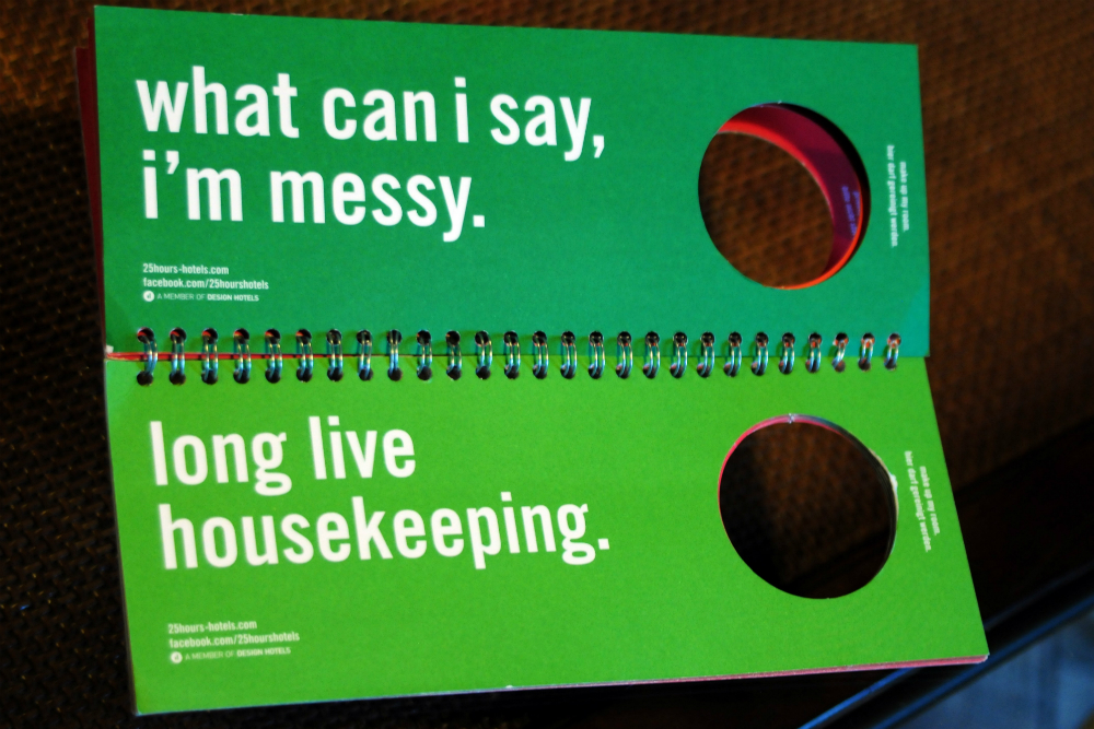 The red pages contain inscriptions explaining why you don’t want to be disturbed – “Still naked”, “Something it’s better not to know”, “Crime scene. Move along” – and the green ones give an idea as to why the room needs attention – “What can I say? I’m messy”, “Long live housekeeping”.