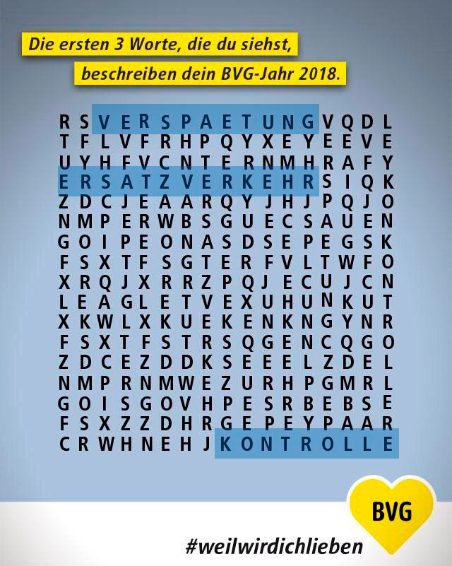 For example, in Berlin, there is even an opera aria about how badly the underground railway system works. What’s more, in 2017, the BVG posted a wordsearch on their official Facebook account and asked visitors to look for three words. They said that they managed to find “punctuality,” “reliability,” and “satisfaction” – and then they asked what alternatives the visitors might have found…