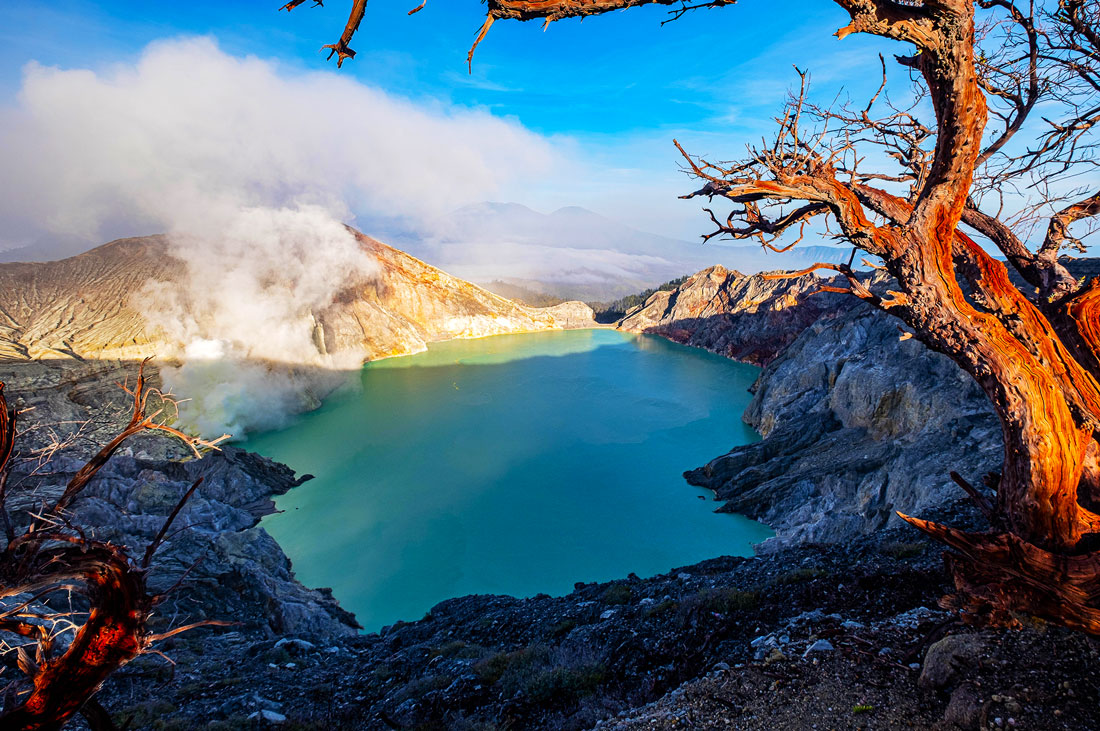 Getting up to the world’s largest acidic lake, you need to slog it up the side of the volcano (about 3km) and then drop down into the crater. It’s best to go at night, around 2 am. As you ascend, you will be rewarded with wafts of sulfurous gases, light blue flames, and bright yellow chunks of sulfur. Doesn’t sound too attractive, does it? As you get closer, you see the bright blue flames, ribbons of gaseous sulfur, heated to 600 C, erupting from fissures in the mountain and igniting on contact with the oxygen in the air.