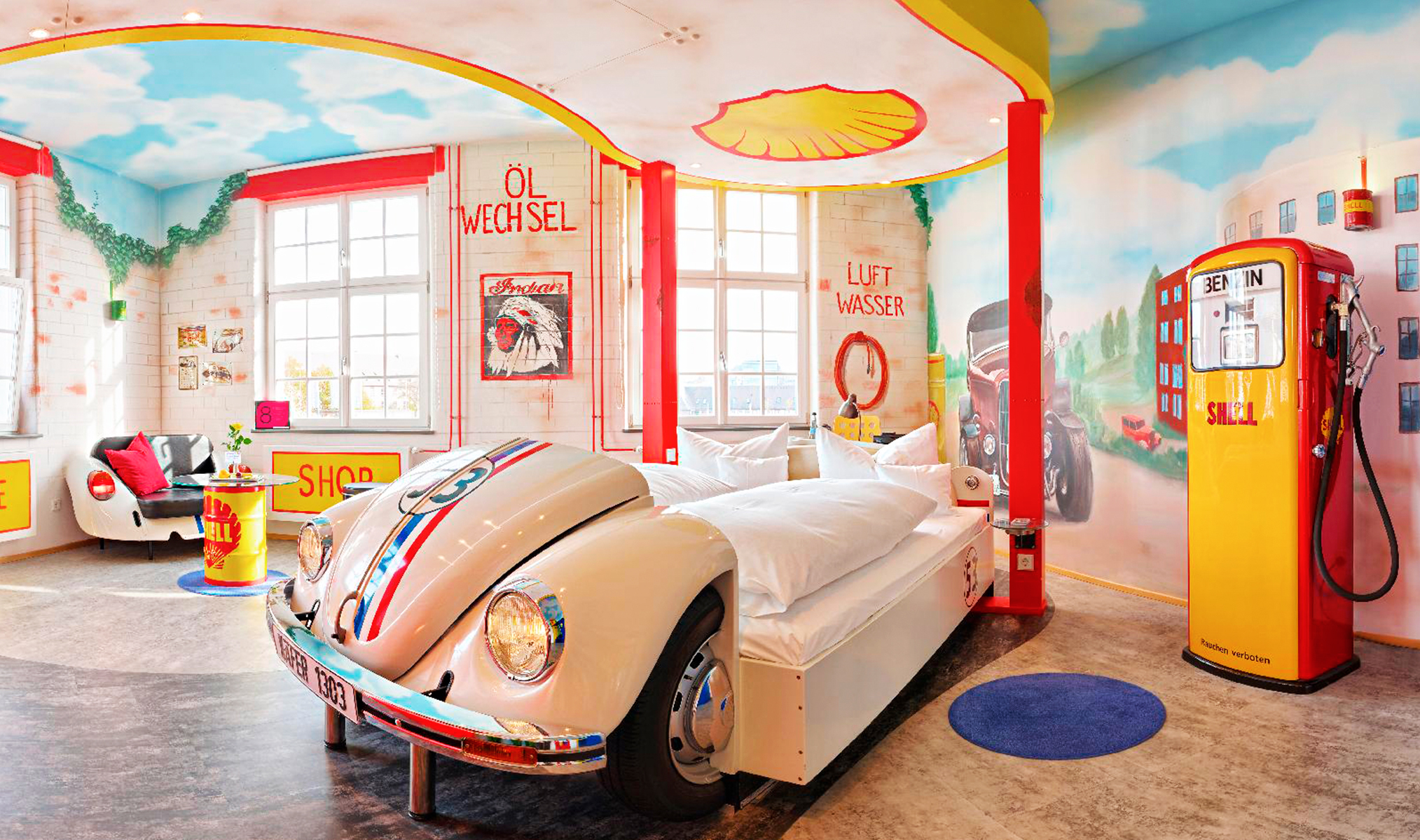 The interior is entirely car-themed: Cadillac beds, desks with spare parts, pictures of famous cars, flower beds made of a motorbike and even car-shaped soap bars.