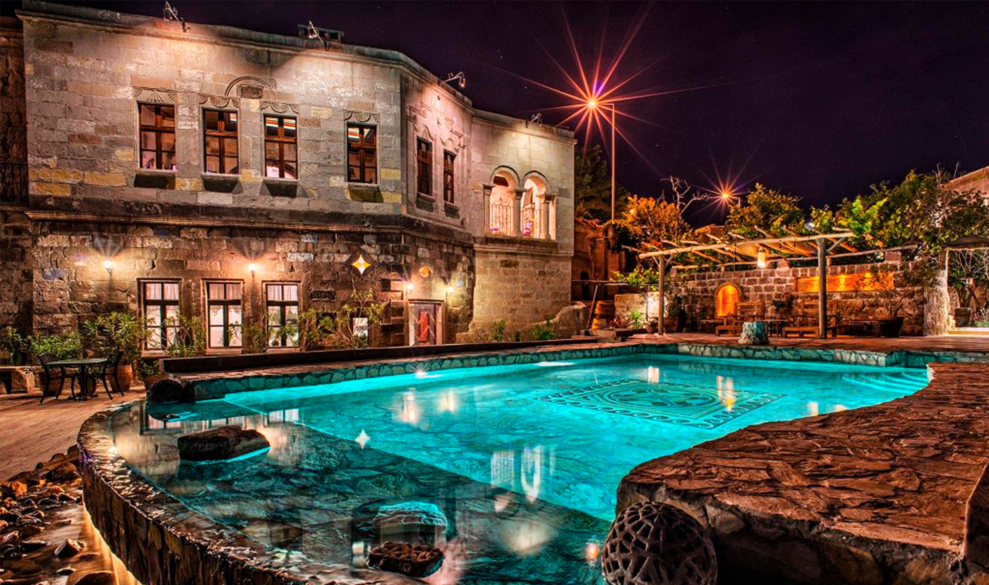 The hotel is situated in the town of Uchhisar, where you can dive into the region’s non-touristy life. Museum Hotel is completely hidden away in the cave, which adds coziness and an aura of mystery to the interior! The premises include an amazing swimming pool with a bar, a spa center, fitness center, a conference hall and a restaurant.
