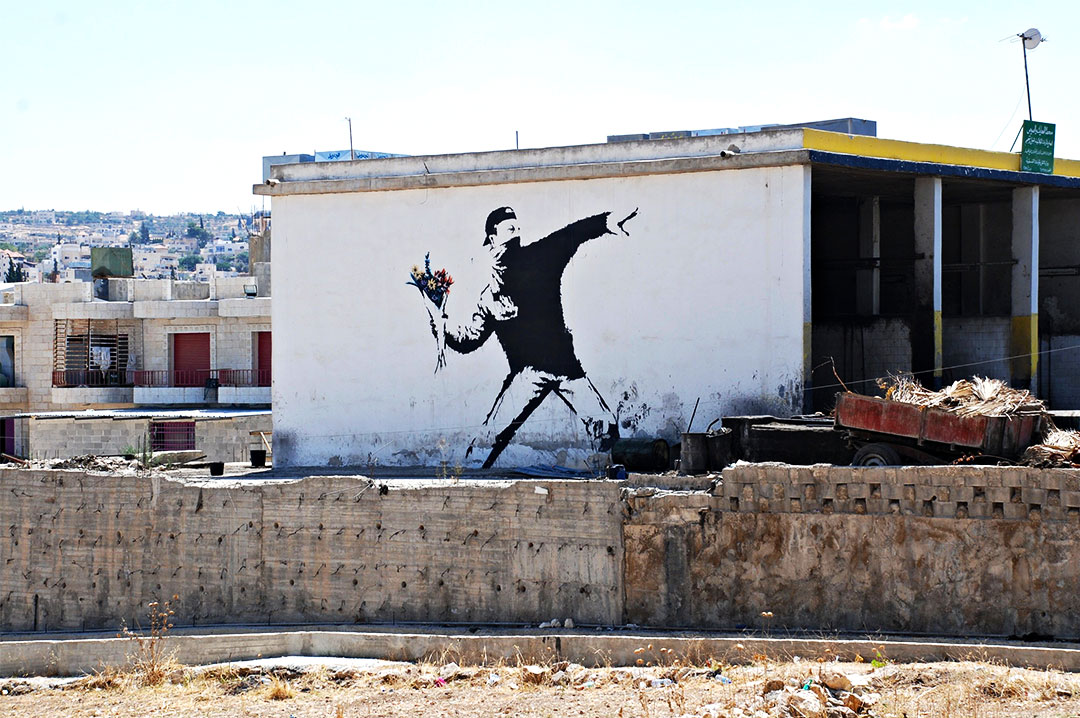 The Flower Thrower portrays a person in a mask throwing a bouquet of flowers instead of a Molotov cocktail. The meaning is obvious — the artist doesn’t want a war between Israel and Palestine.