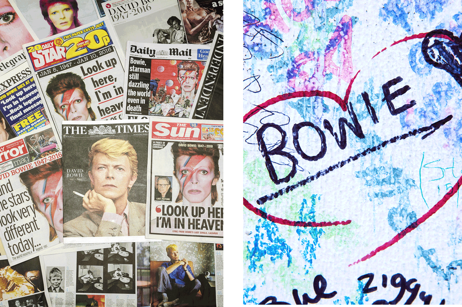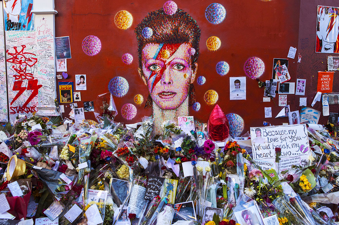 Description and history: Graffiti bigger than the size of a person appeared on the wall of a shop, Morleys, in 2013 — Bowie was born literally just around the corner.