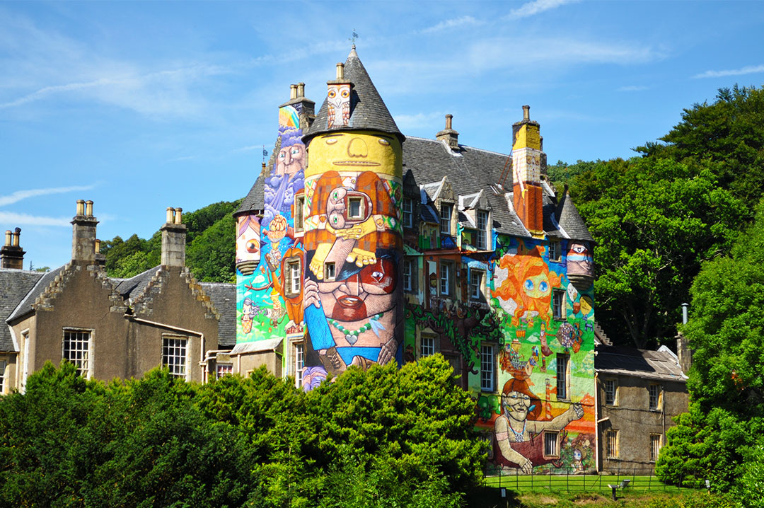 Description and history: Kelburn Castle was built in the 13th century, so it’s no surprise that it required significant reconstruction by 2007. The castle’s owner, Patrick Boyle, Earl of Glasgow, suggested that the state agrees to an original idea — he invited famous street artists to paint the castle facade.