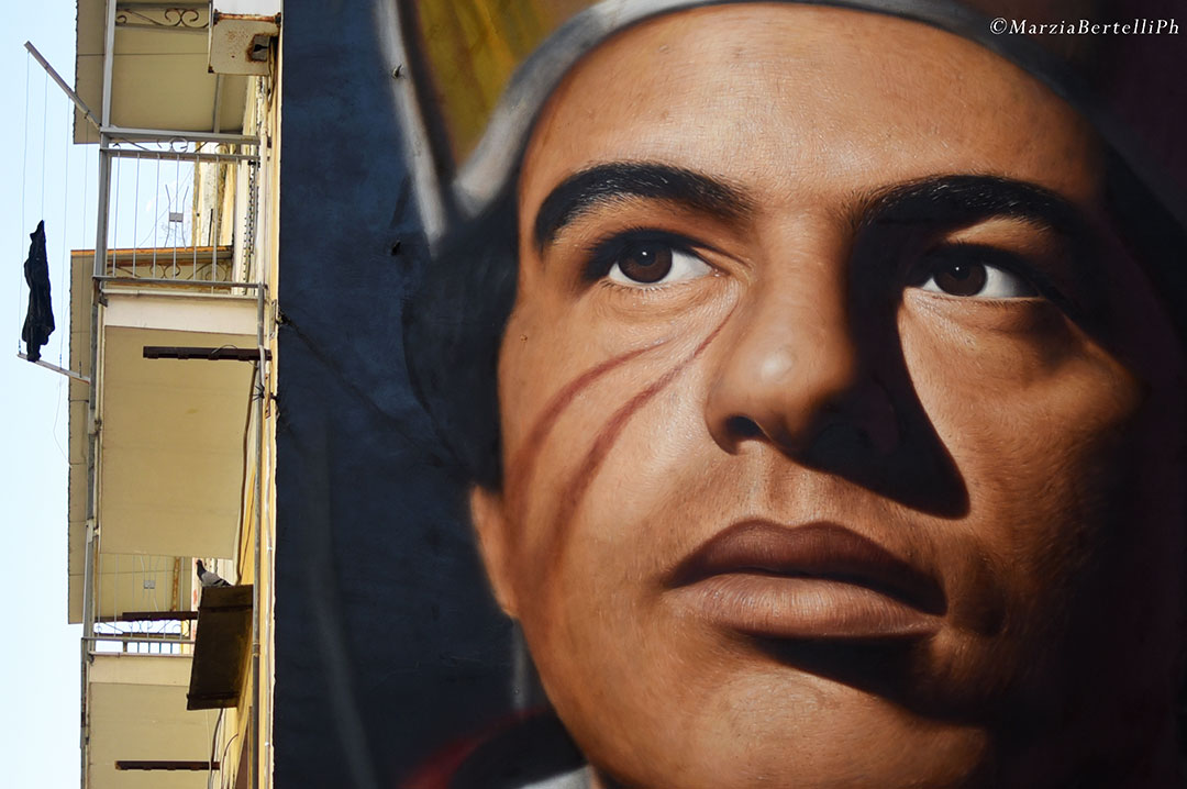 Description and history: It’s only in Naples that you can discover street art portraying a saint. This city has found an amazing way to combine fanatic piety with absolute love for contemporary art. This huge graffiti piece in realism style covers an entire wall in the Forcella neighborhood, which is considered one of the most dangerous neighborhoods in the city (due to the Naples mafia, the Camorra).