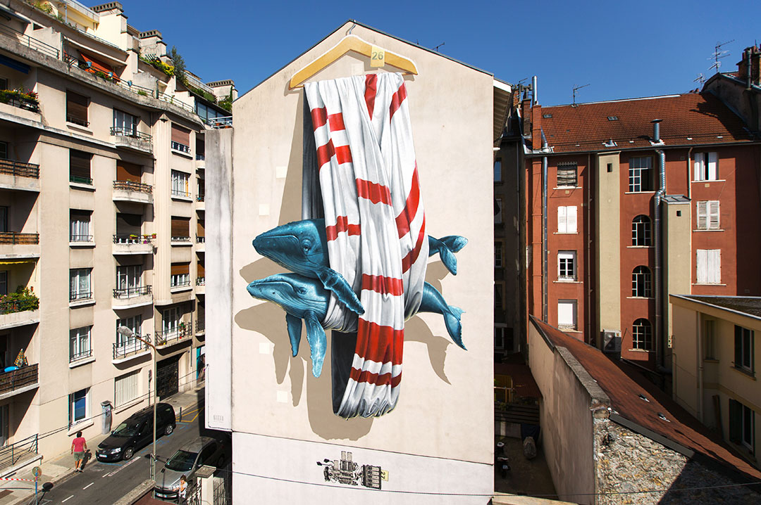 Description and history: The huge graffiti covering an entire wall portrays two realistic whales hung from a clothes hanger wrapped in a piece of cloth. The artists wanted to highlight the problem of mankind exploiting natural resources. This work appeared on the wall to mark the festival of street art in Grenoble in 2016.